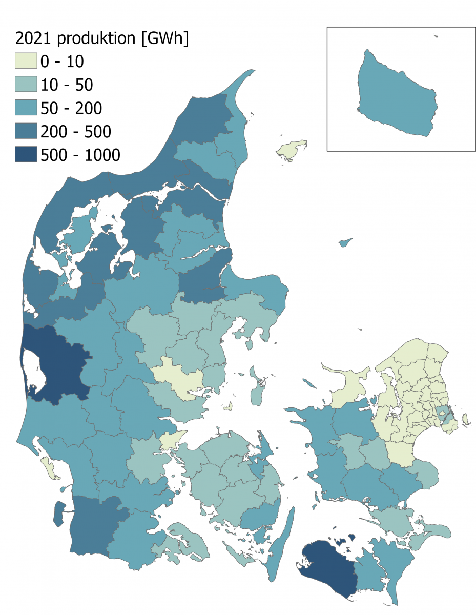 Oversigtskort som pr kommune viser elproduktion i 2021 fra landplacerede vindkraftanlæg