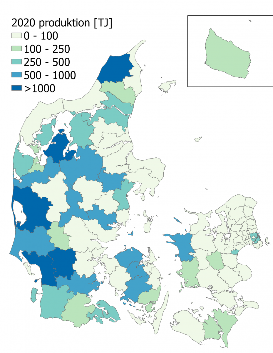 Produktion af energi fra hhv. vindkraft, solceller og biogas i de enkelte kommuner er illustreret i nedenstående tre kort.