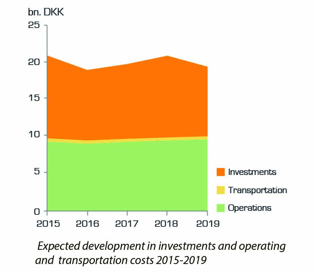For the period 2015-2019, investments and costs are expected to total about DKK 51 billion. Investments consist of expenditures for exploration and field developments, while costs break down into transportation and operating costs.
