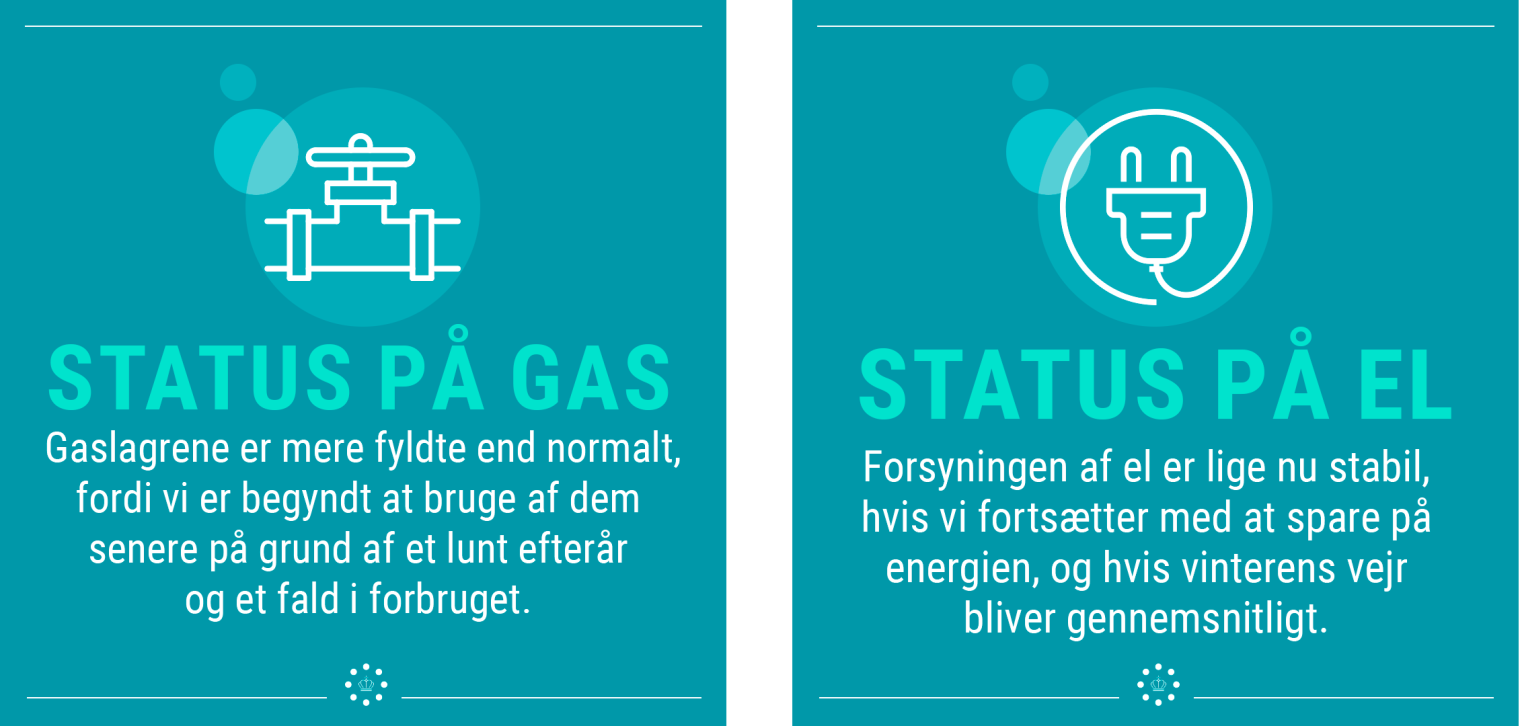 - Energistyrelsen vurderer på nuværende tidspunkt, at det ikke bliver nødvendigt at afbryde strøm- og gasforsyningen til forbrugerne i denne vinter, hvis forbrugerne fortsætter med at spare på energien som hidtil, og hvis vejret bliver gennemsnitligt.